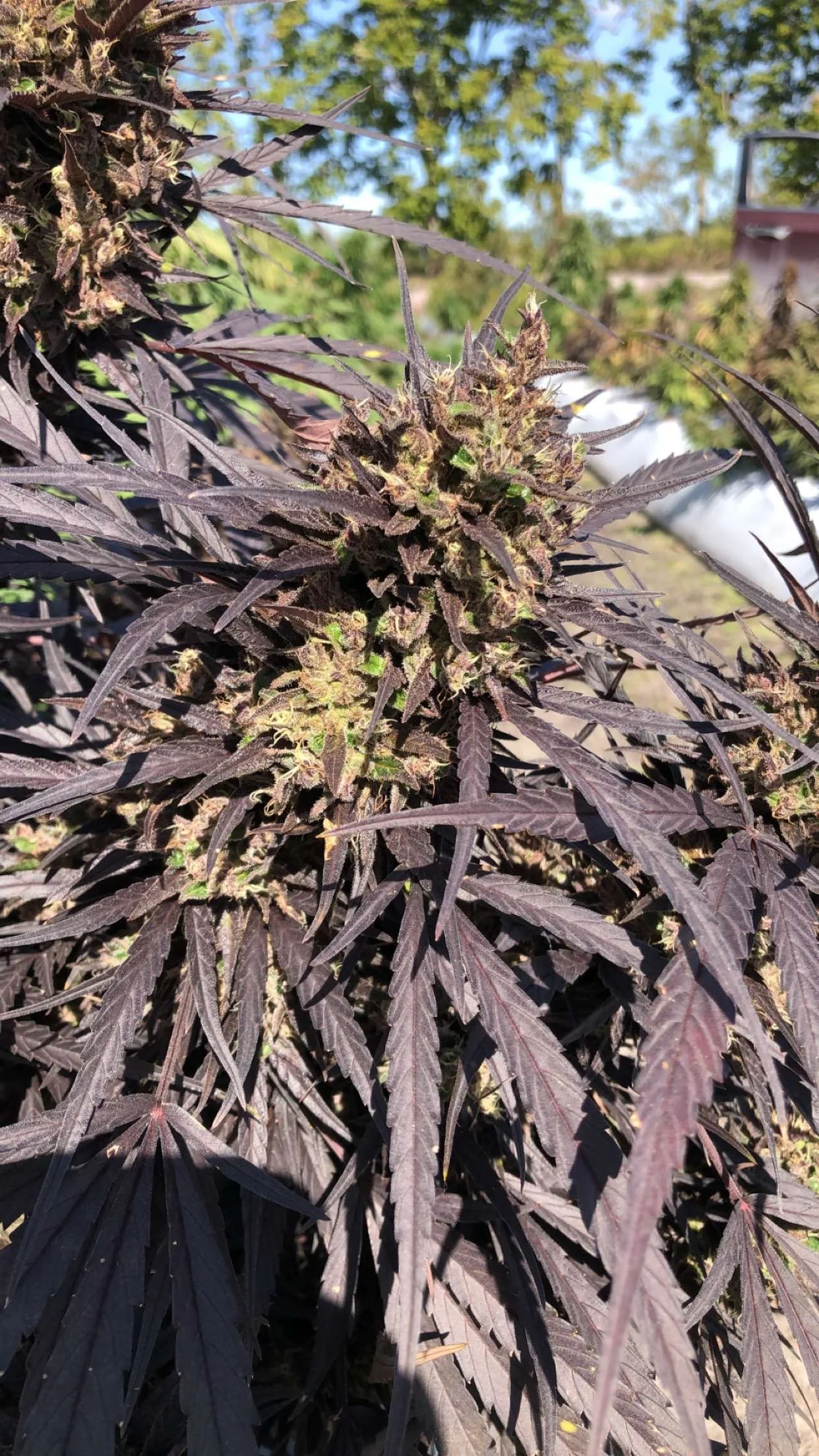 Light green and full of trichomes, easy to trim, with compact globular like buds. Very few pistils that are short in size and light orange in appearance. A squat bushy growth habit with large fan leaves. This varietal has a low growing plant that holds up well to high winds.